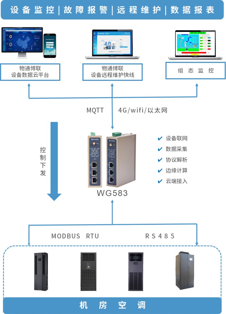 物通博联(WideIOT)通过部署数据采集终端,能够接入多个温湿度传感器实现一对多数据采集,并通过以太网对接到机房管理平台中,确保数据采集通信的安全稳定与完整可靠,为机房环境监控与管理提供数据支持。