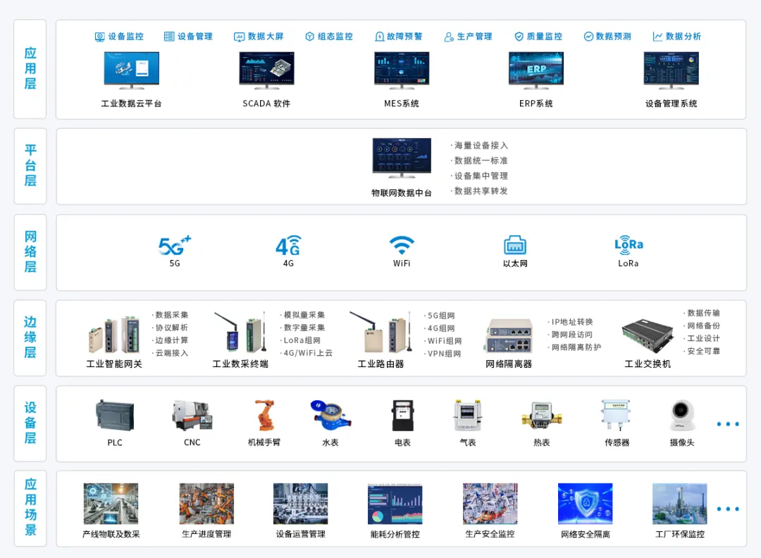 通过工业智能网关、数采终端、工业边缘计算机等硬件,在 5G 网络支撑下,实现 PLC、数控机床、机械手臂、注塑机、水电气热表、能源设备、安防、 环保监控设备等全品类设备一站式接入。依托边缘预处理能力,解决工业协议不统一、数据格式杂乱的核心痛点,为数据价值挖掘奠定基础。