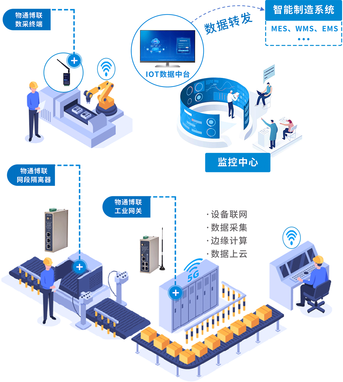 物通博联聚焦工厂数字化转型,构建 “边缘接入 - 数据处理 - 应用落地” 技术体系:以工业智能网关、数采终端等边缘硬件,接入工厂生产设备、能耗设备、安防监控设备,解析异构协议并做边缘预处理。再将标准化数据上传至物联云平台与 MES 系统,同时依托 IOT 数据中台实现数据资产化管理,支撑设备监控、能耗分析、生产可视化等应用。最终打通 “设备 - 数据 - 业务” 链路,助力工厂完成生产运营数字化升级,为柔性生产、预测性维护等新业务提供技术底座。