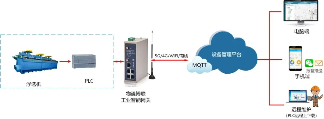 解决方案 通过在浮选车间部署物通博联工业智能网关,接入各个浮选机的PLC系统,实现对PLC数据的快速采集与协议解析,包括设备状态、工艺参数、告警信息等。随后以5G/4G/WIFI/以太网等多种通信方式,可将采集到的数据安全、稳定地传输至选矿厂管理系统中,为后续的数据处理、分析与应用提供可靠的数据来源,促进企业科学决策、高效管理。