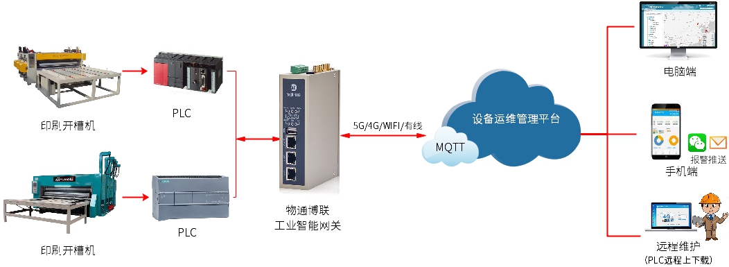 解决方案 物通博联提供以工业智能网关+设备运维管理平台+设备维护快线为核心,构建印刷开槽机智慧运维管理系统。 通过接入印刷开槽机PLC,工业智能网关能够实时采集设备的运行状态、工艺参数、故障信息等,并通过5G/4G等网络将数据安全传输至企业设备运维管理平台中,从而实现对分布式设备的可视化展示、远程监控、故障告警、运维管理、远程维护与数据分析,进而通过数字化手段优化运维流程,降低管理成本,提升服务响应速度,助力企业从“设备销售”向“设备+服务”的高附加值模式转型。